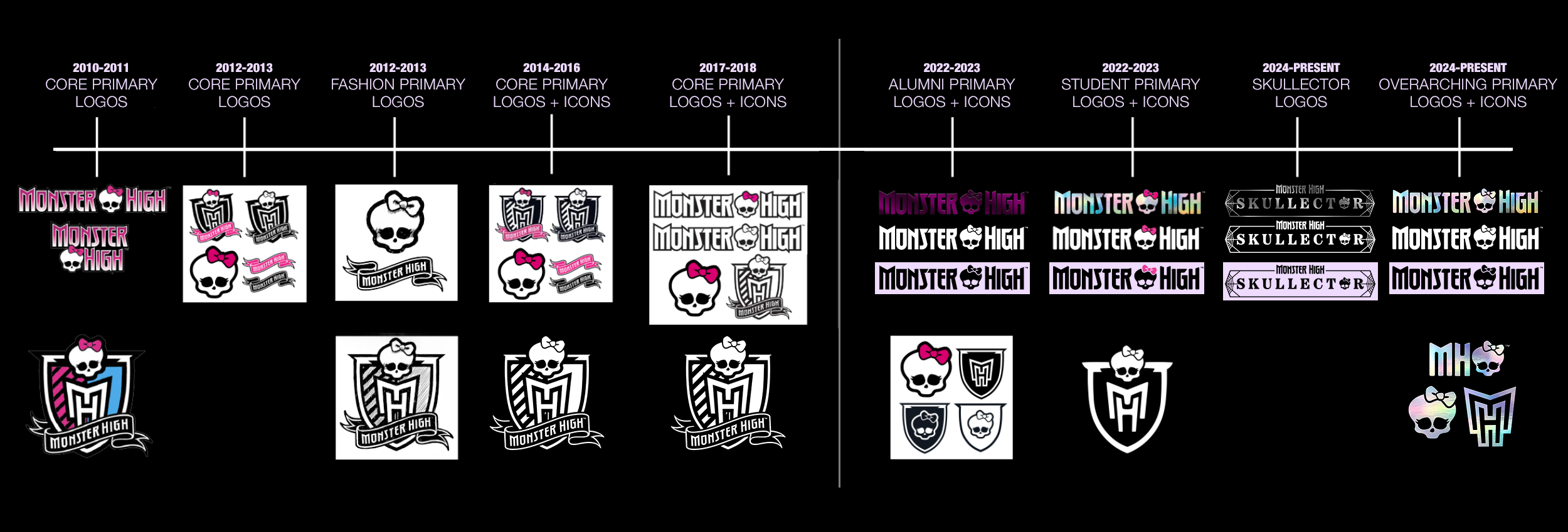 Monster High is made up of dolls made for people of all ages with two very distinct product lines. In order to clearly distinguish between brighter, trend-forward, creepy-cute dolls intended for a younger audience (“Student”) and the darker, elevated, creepy-cool dolls intended for an older audience (“Alumni”) we developed differentiated branding. And to sit over both, we created a streamlined overarching Core brand palette that served as the overarching umbrella branding that encompassed both Student and Alumni (aka Skullector) lines.